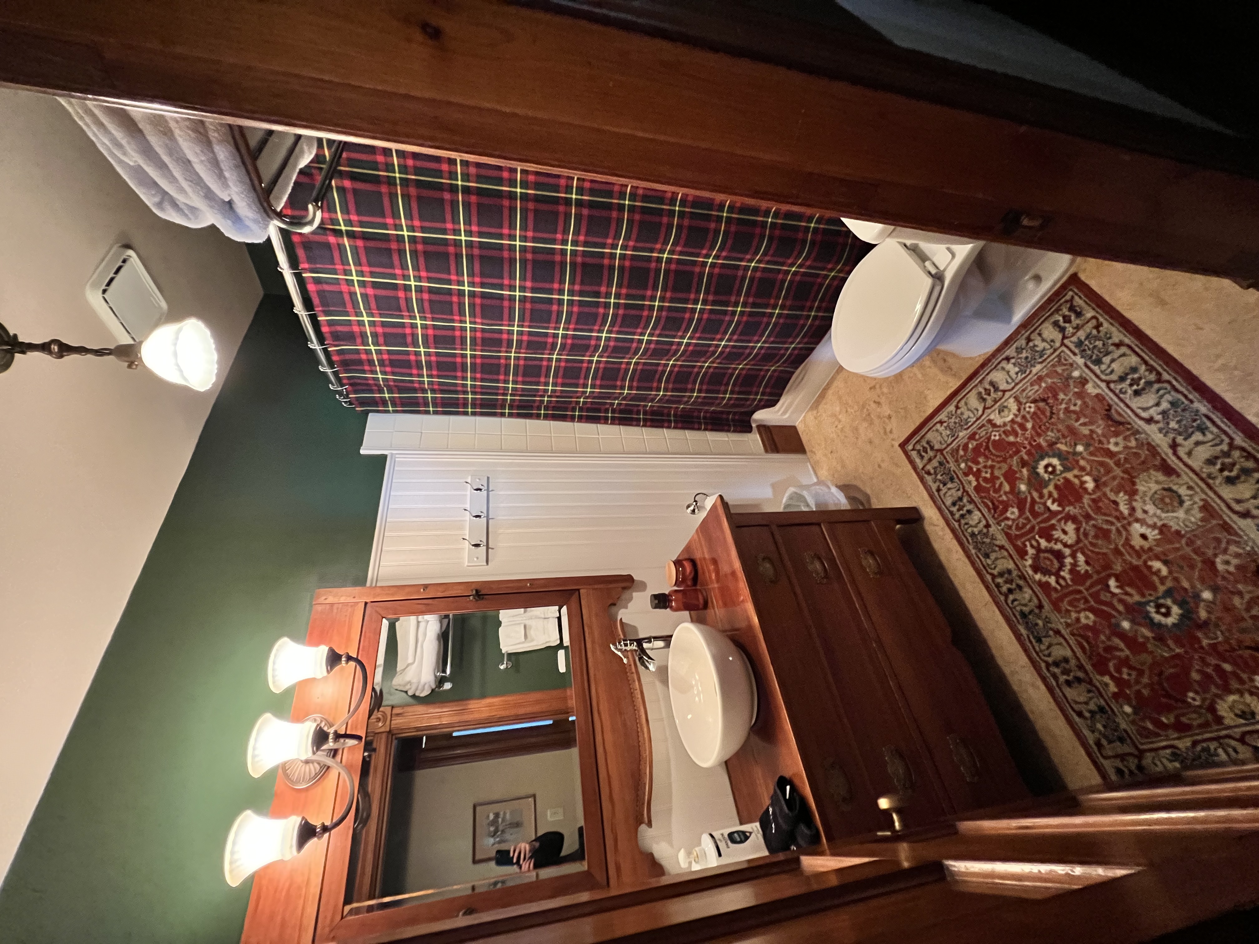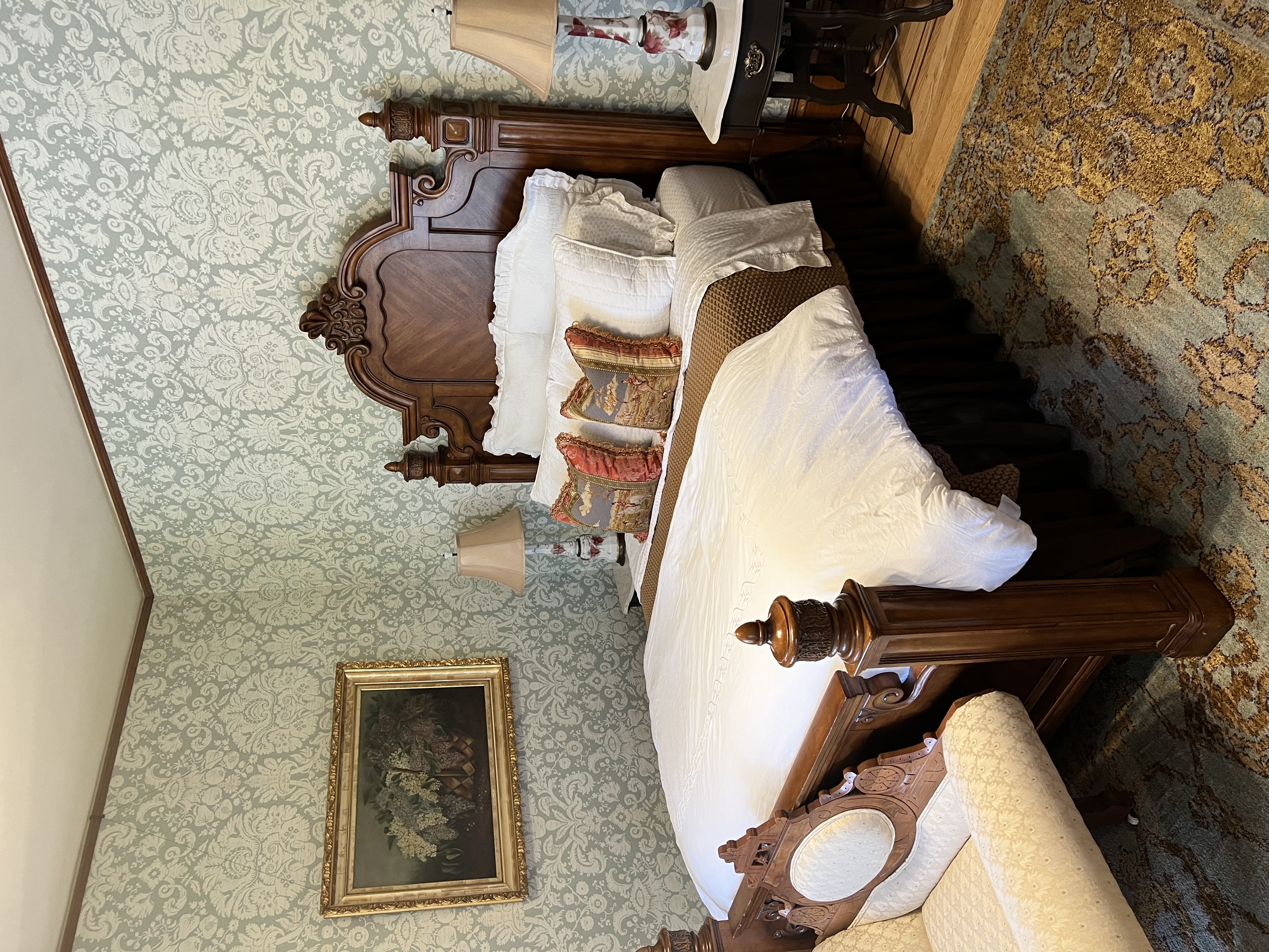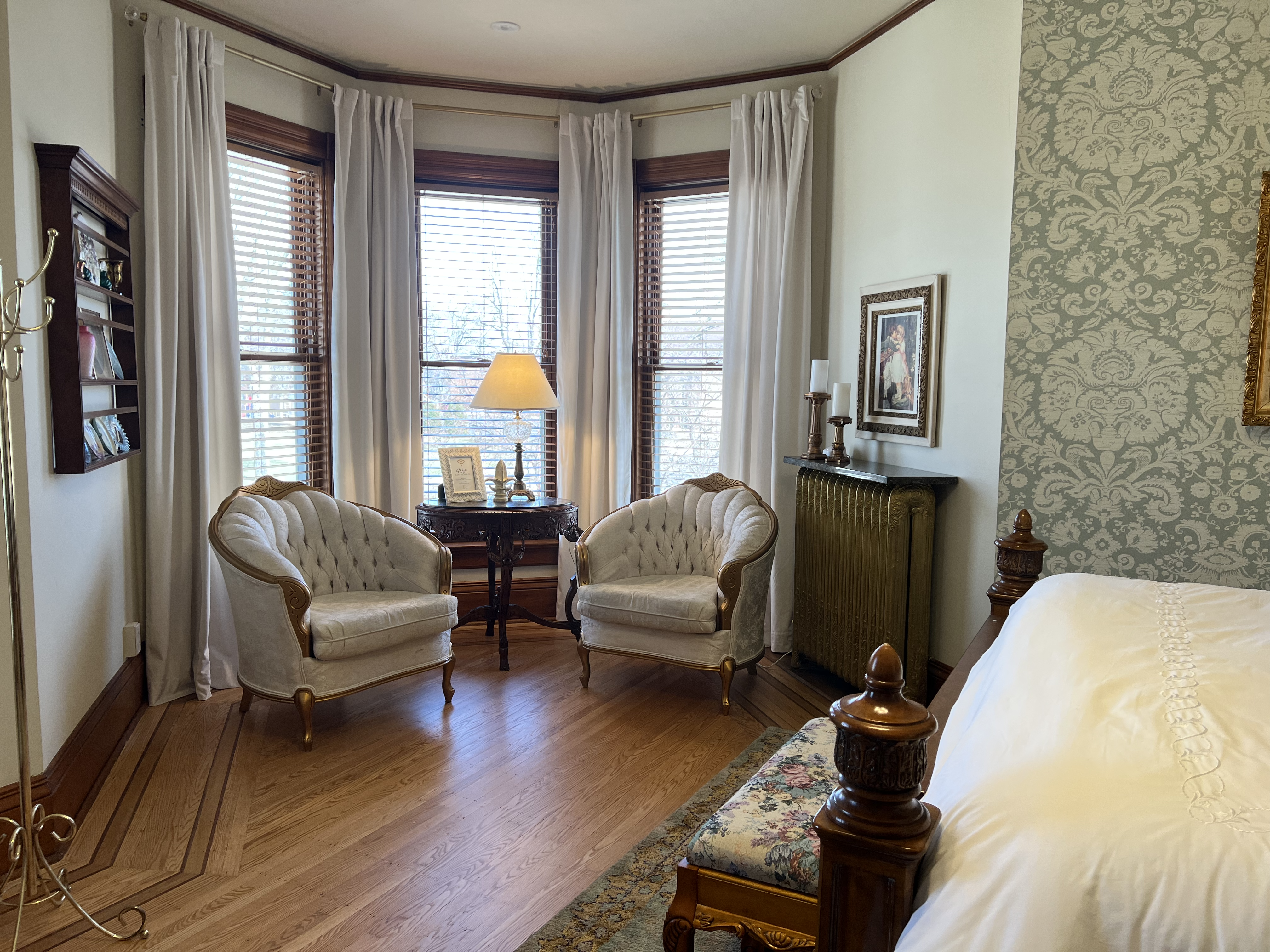 The Hutchinson Suite invites you to experience Queen Anne Victorian charm at its finest, featuring a breathtaking panoramic view from our iconic second-floor turret. This historic hideaway is bathed in bright, natural light that accentuates the exquisite architectural details of a bygone era. Centered around a plush queen bed with premium linens, the suite is designed as a restful escape. Relax in your private turret seating area, the perfect nook for unwinding after a day of discovery.