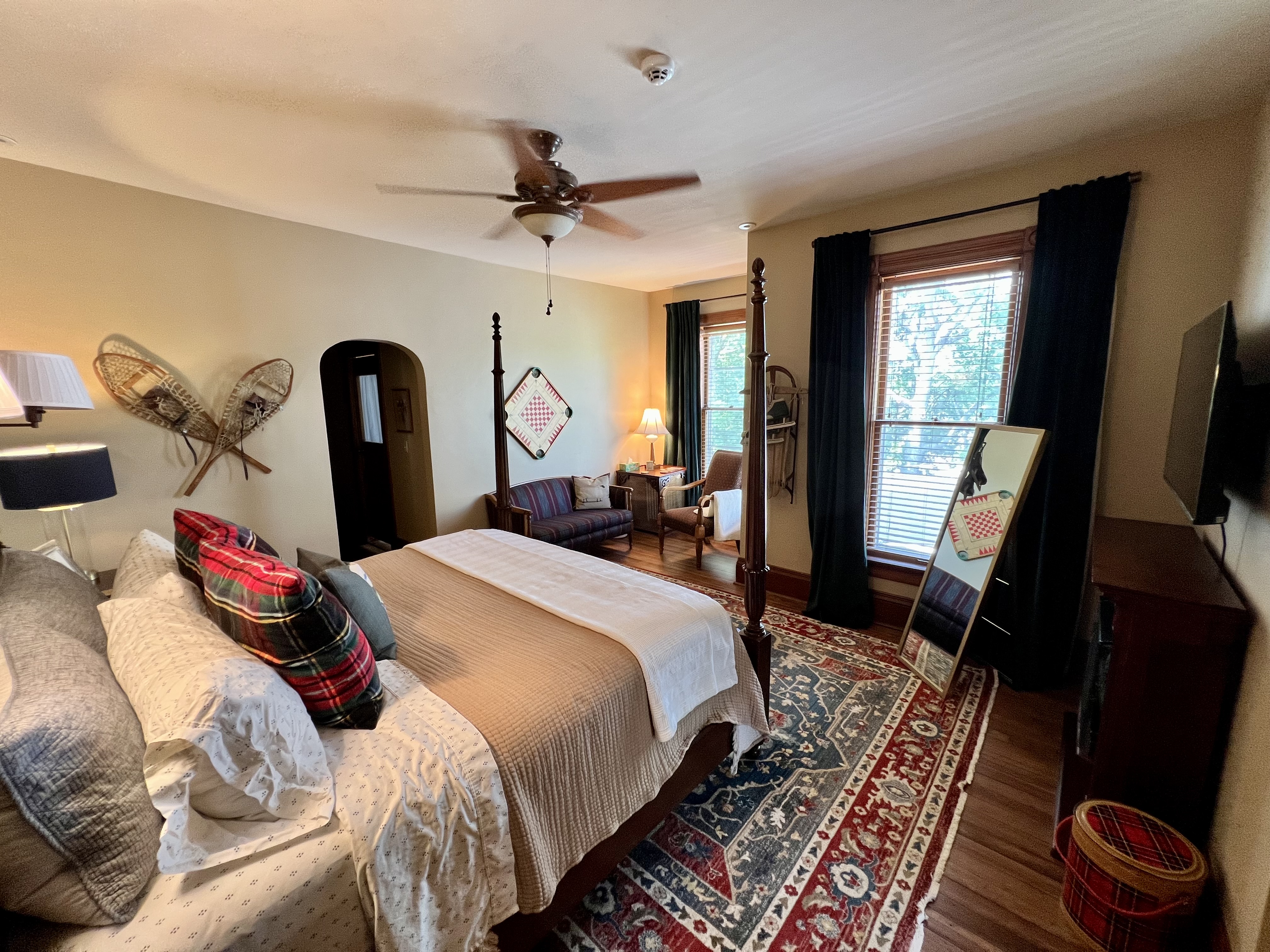 Discover a getaway inspired by the pristine spirit of a cabin up north. The North Star Suite blends Ralph Lauren-influenced design with Victorian elegance, featuring a magnificent four-poster king bed draped in high-thread-count linens. This second-floor retreat is designed for the discerning traveler, offering a private seating area flooded with soft light—the perfect spot to cozy up with a good book. Every detail, from the rich textures to the curated artwork, invites a sense of peaceful exploration.
